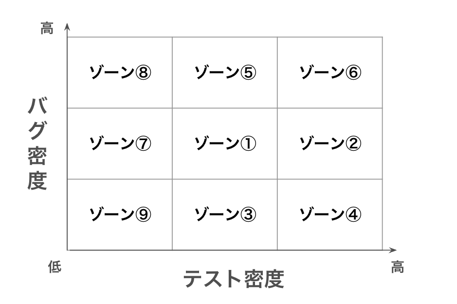 このテスト密度とバグ密度の2つの指標をもとに、テスト対象のプロジェクトを以下の9つのゾーンに分類することでそれぞれのゾーンにおけるテスト密度とバグ密度のパターンを視覚的に把握することができます。